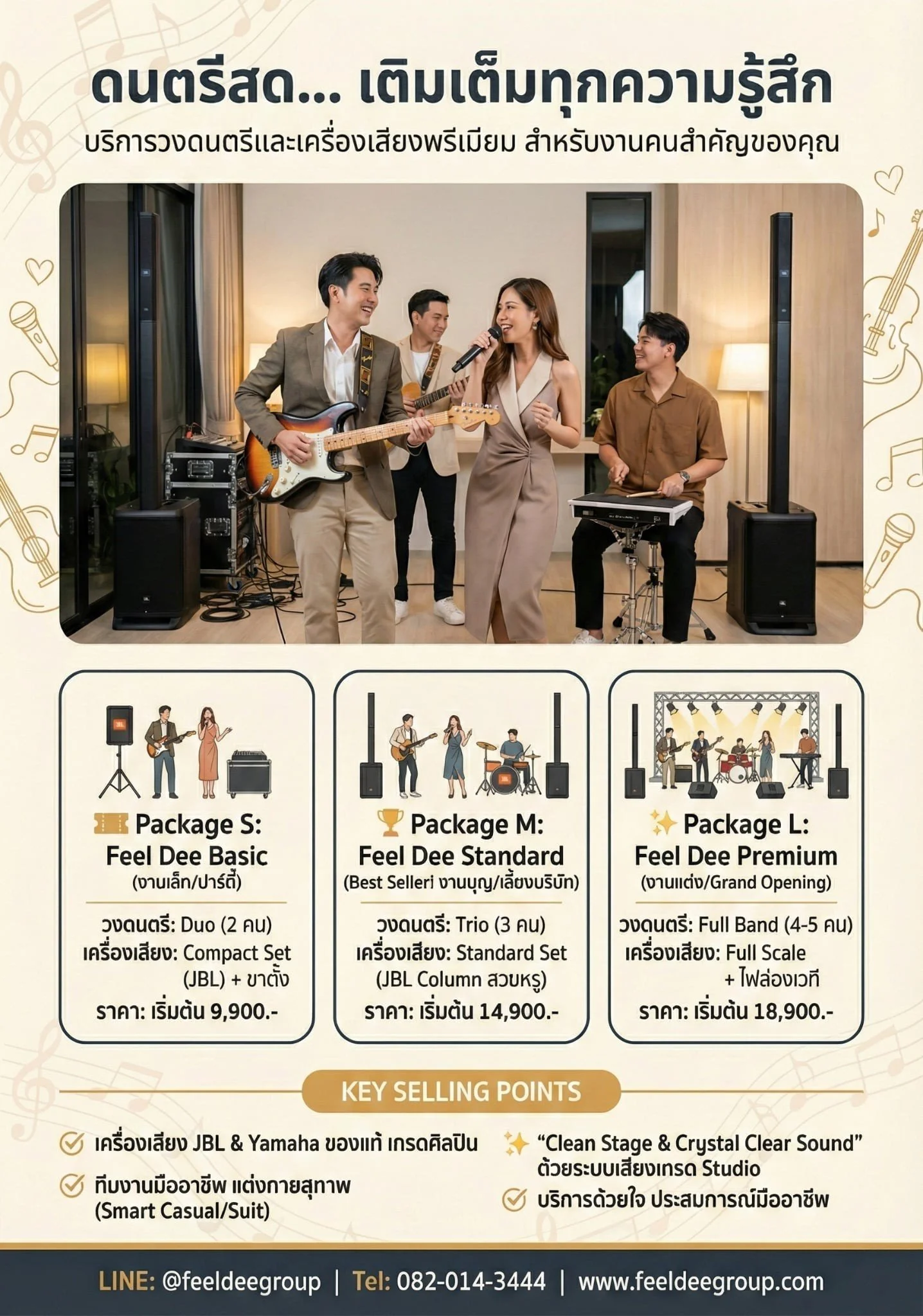 Package L: ฟีลดี Premium สำหรับงานแต่ง/Grand Opening (วง Full Band 4-5 คน พร้อมเครื่องเสียง Full Scale และชุดไฟเวที ราคาเริ่มต้น 18,900.- บาท